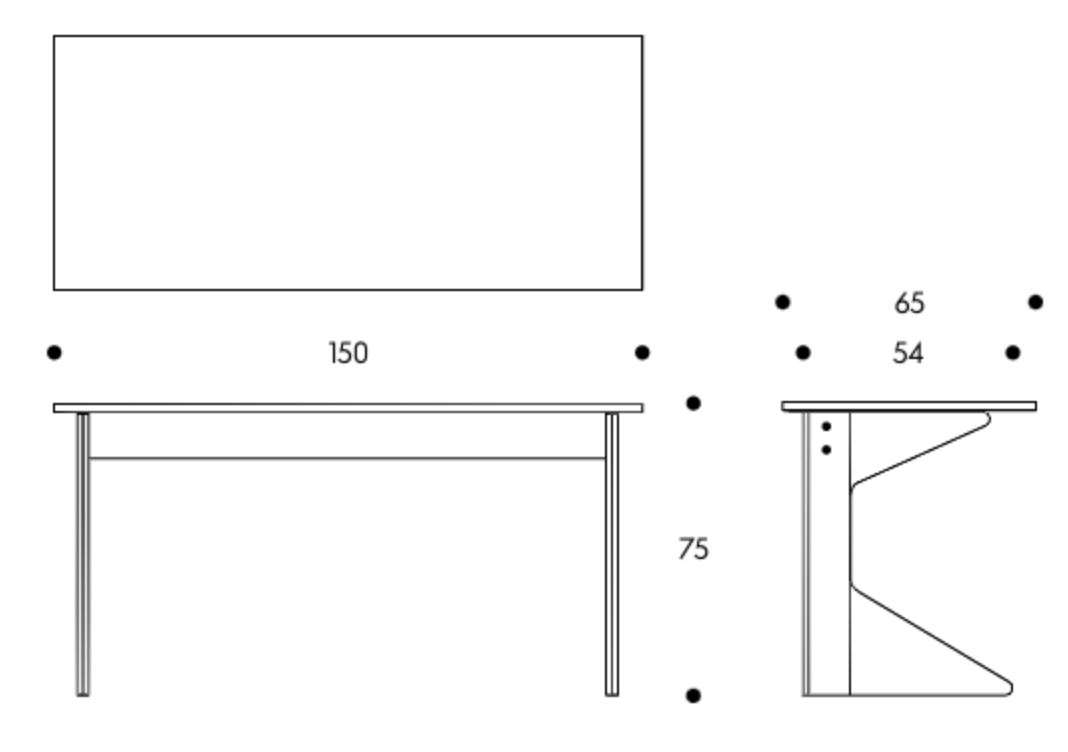Matériaux : chêne avec vernis de protection incolore ou noir, renforts en acier et revêtement par poudre noir, plateau en HPL ou linoléum