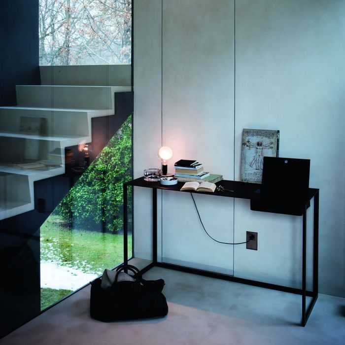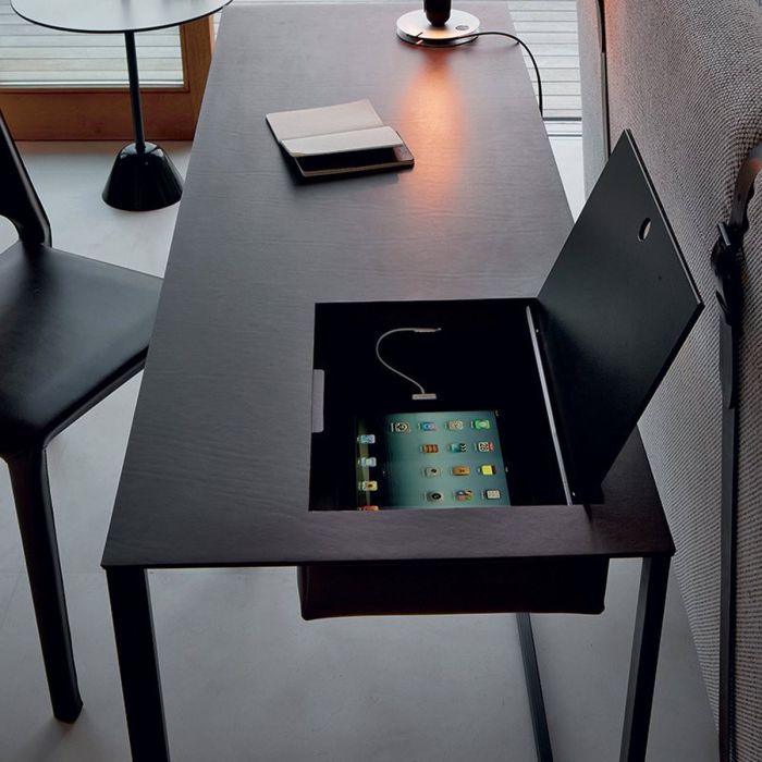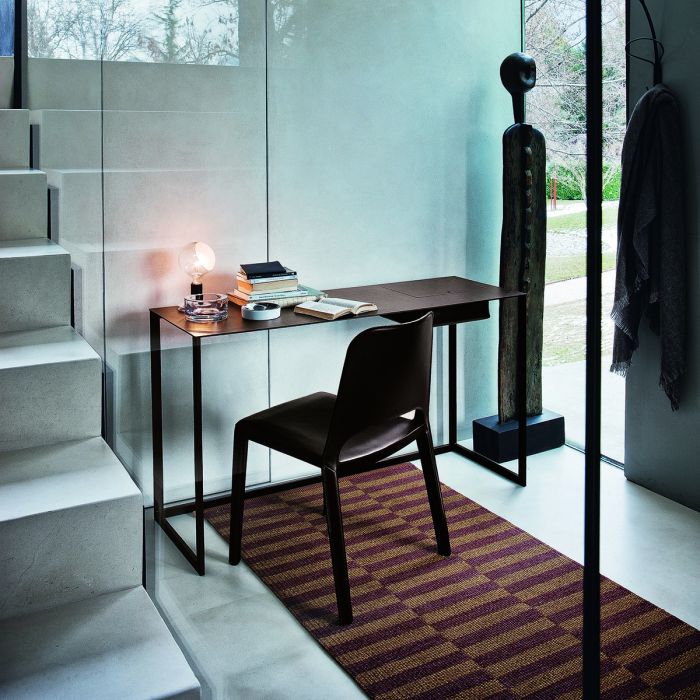Le bureau-console CALAMO est un objet qui s’intègre parfaitement à la collection pour le living Party, dessinée par Gabriele Rosa pour Zanotta en 2012 : structure en acier verni couleur graphite avec le revêtement en cuir pigmenté pour le plateau et une embrasure porte-objets accessible grâce à l’ouverture à abattant. Calamo permet de créer un coin bureau fonctionnel et design dans différentes pièces de votre maison et il peut également faire office de console.