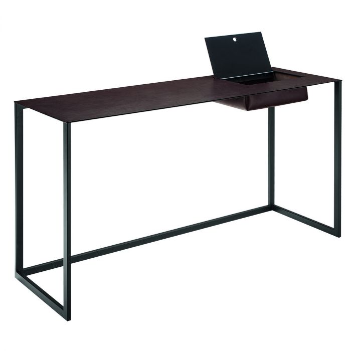 Matériaux : Structure et plateau en acier verni graphite, Plateau recouvert de cuir sellier ainsi que le tiroir en cuir sellier marron 0806 (accessible par une ouverture à battant située sur le plan de travail)