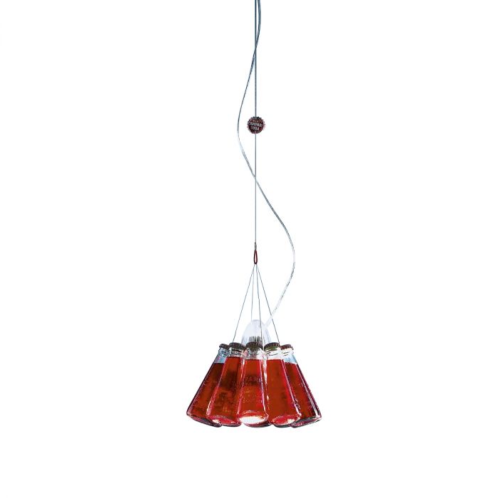 Campari light suspension de Ingo Maurer. Dix bouteilles originales de Campari Soda, détachables individuellement, matière plastique, métal. Réglable en hauteur sans granduation par une capsule Campari.