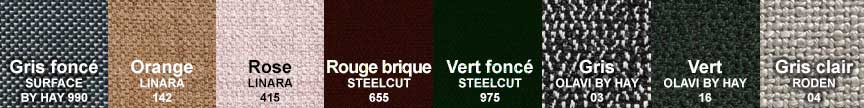 Finitions : structure noire chromée, coloris assise orange (Linara 142), rose (Linara 415), rouge brique (Steelcut 655), vert foncé Steelcut 975), gris (Olvavi by Hay 03) ou vert (Olavi by Hay 16)