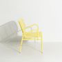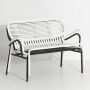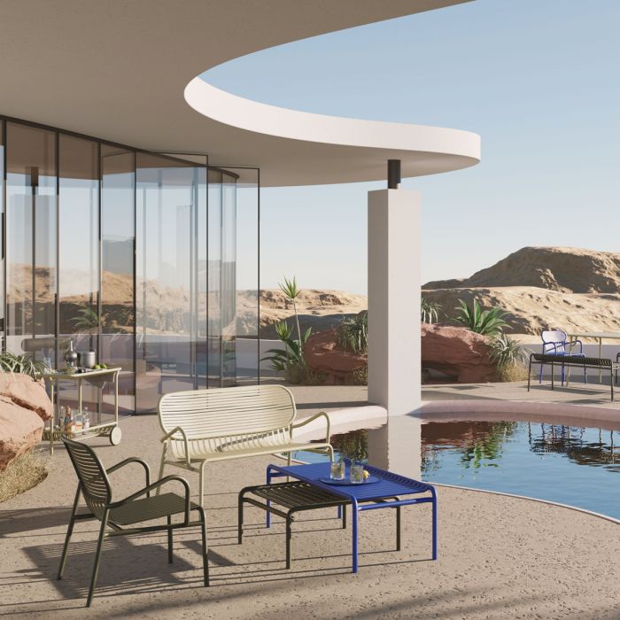 Canapé de jardin Week-end de Petite Friture par le studio Brichet Ziegler. La collection week-end est une gamme de mobilier outdoor complète. Pensée pour une utilisation pratique, les canapé de jardin sont empilables. La forme ovale et cernée dessine les dossiers pour qu’ils deviennent un signe graphique. Le travail des lattes horizontales et verticales comme des rayures, souligne les pleins et les vides, affirmant l’identité de la collection.