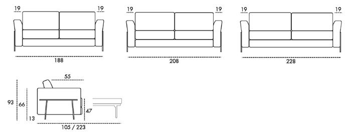 Canapé convertible avec sommier électro-soudé, système d'assise avec sangles élastiques, pied h13, matelas h 14 OS 30 et mécanisme sans range-oreiller. L'ouverture se fait d'un seul mouvement et il n'est pas nécessaire de démonter les pièces et/ou la tapisserie pour passer de la position canapé à la position lit.