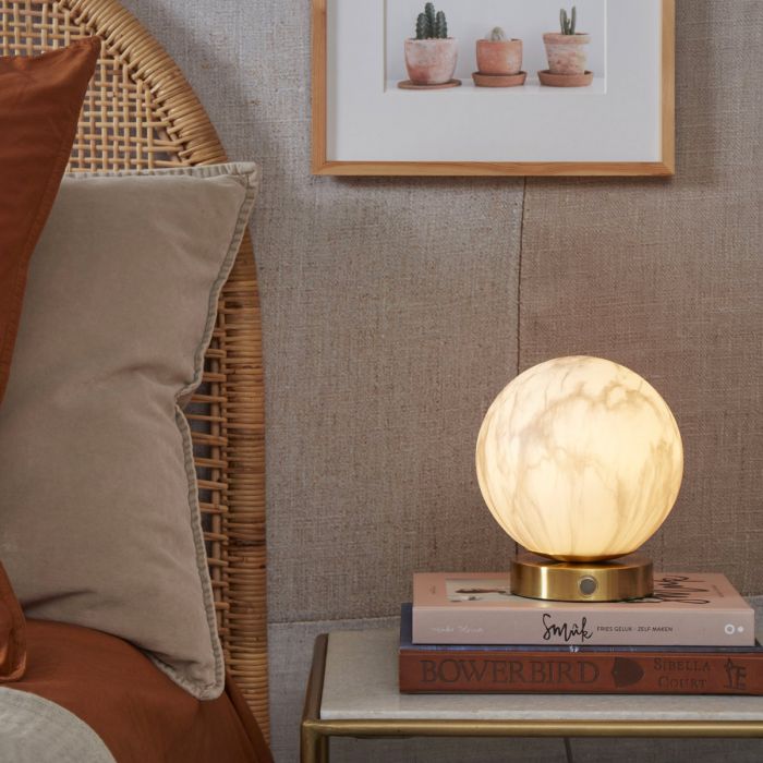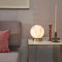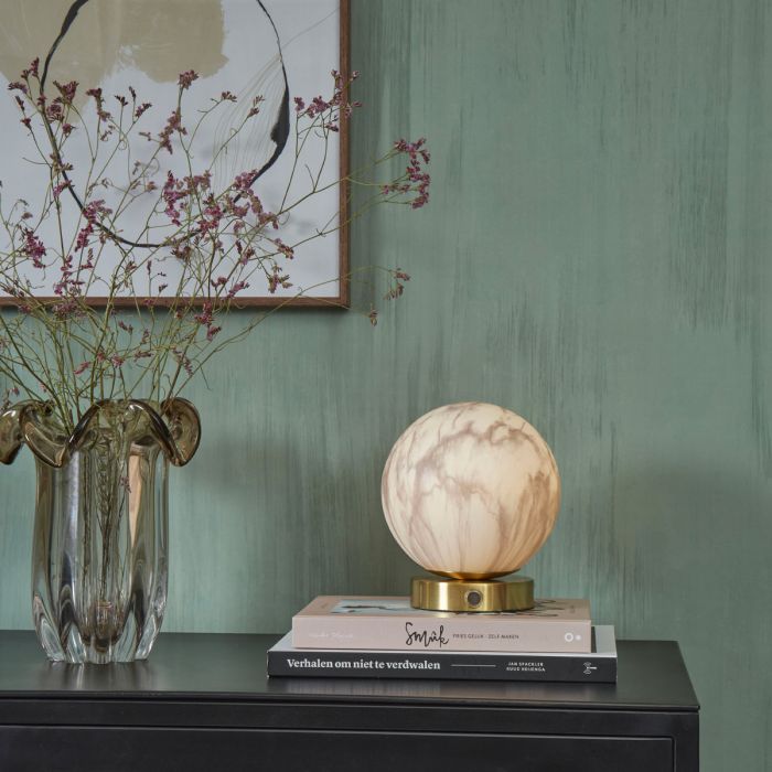 Carrara de It’s about Romi. Lampe de table avec une base doré pour faire ressortir le diffuseur en verre blanc opalin effet marbre très réaliste.