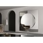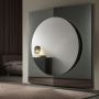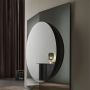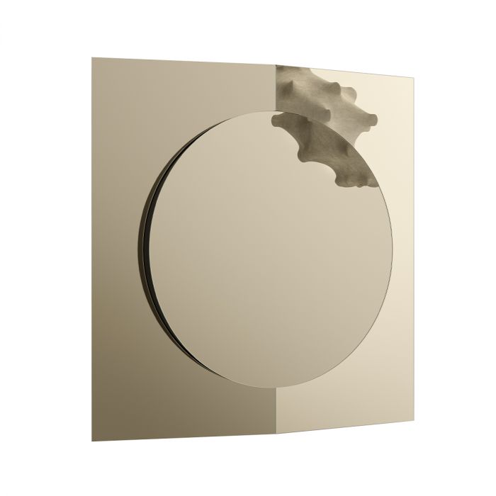Miroir mural avec structure en bois formée de deux panneaux de miroir légèrement inclinés et d'un troisième élément central circulaire. Les finitions des trois panneaux sont disponibles en miroir, miroir doré, bronze ou miroir fumé qui peuvent être combinés entre eux.