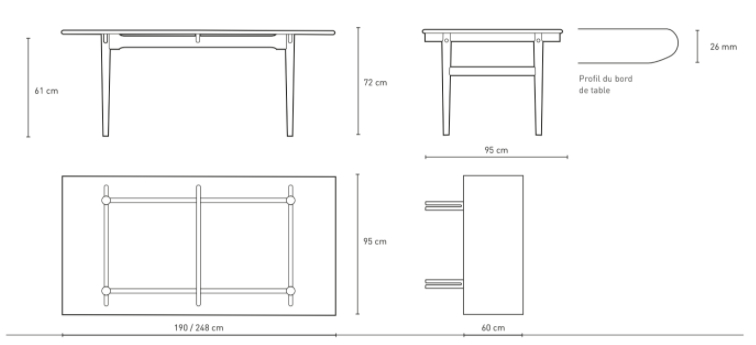 Le dessus de table en bois massif est fabriqué à partir de lattes de bois dur qui couvrent toute la longueur de la table, ce qui donne une belle surface aux lignes douces et propres. Le dessus de la table semble flotter au-dessus du cadre grâce à ses bords magnifiquement effilés, ce qui rend le design extrêmement léger et attrayant. Une table à manger séduisante, le CH327 peut également servir de beau bureau ou table de conférence dans n'importe quel espace. Le tableau CH327 de Wegner montre comment la passion et le dévouement à l'artisanat peuvent remplir la promesse inhérente du travail d'un grand designer.