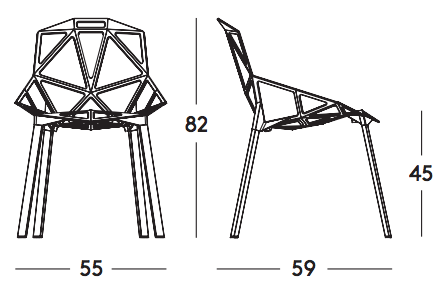 Chair_One, une chaise absolument unique. La coque est une structure réalisée avec des formes géométriques planes qui s’unissent par les côtés comme un ballon de football. Une forme obtenue après une longue étude préparatoire, entre esquisses, maquettes en carton et prototypes, avant d’être réalisée en fonte d’aluminium poli, brillamment inaltérable, ou avec traitement ou titane fluoré et verni adapté pour l’utiliser à l’extérieur. architecture contemporaine.