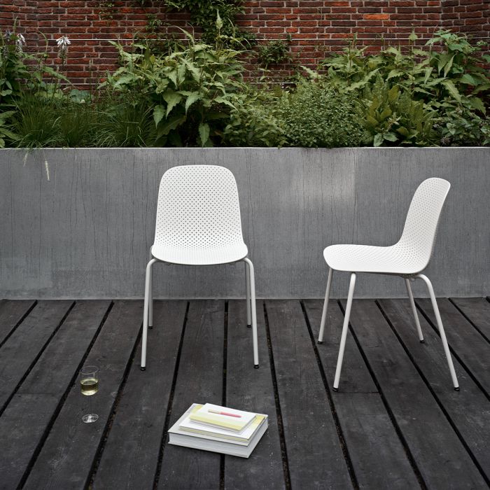 La chaise 13Eighty de HAY, conçue par les designers néerlandais Scholten & Baijings, doit son nom au nombre de minuscules trous dans la coque en polypropylène moulé. Ces perforations créent une esthétique caractéristique, où la transparence et un jeu d'ombres et de lumière ajoutent à l'expression de la chaise, tandis que les variations de taille des trous apportent une impression de mouvement à l'apparence visuelle. Ils ont également une utilité fonctionnelle pour évacuer l'eau de pluie lorsque les chaises sont utilisées à l'extérieur. Disponible avec ou sans accoudoirs dans un design empilable doté de pieds en acier avec un revêtement résistant aux intempéries pour le rendre adapté à une utilisation en extérieur.Disponible dans une variété de modèles, avec ou sans accoudoirs et empilable. 13Eighty est une chaise polyvalente avec des possibilités pour les deux contextes intérieurs et extérieurs.