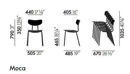 Le piètement du Moca est composé de deux arcs en acier tubulaire l'un formant les pieds avant et le support du dossier, l'autr constituant les pieds arrière. Deux coques en contreplaqué revêtu de placage sont montées sur les éléments du piètement, formant une assise et un dossier confortables aux formes anatomiques. Les coques de Moca sont en chêne plaqué naturel ou foncé et le piètement est disponible en version chromée ou avec une finition époxy mate très robuste. Moca répond à toutes les normes standard et peut donc être utilisé non seulement dans un cadre privé, mais aussi dans des restaurants et autres espaces publics.
