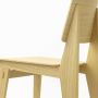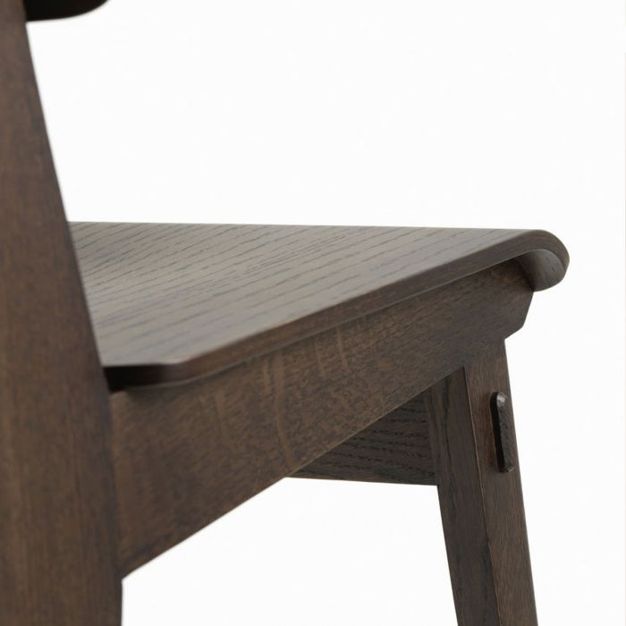 Matériaux : assise et dossier en placage de contreplaqué moulé en chêne massif naturel ou teinté foncé, vernis protecteur naturel, piètement en bois massif