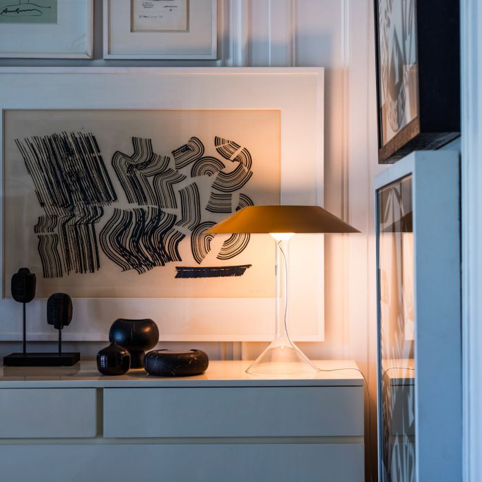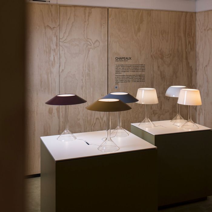 Chapeaux M de Foscarini par Rodolfo Dordoni. Une lampe raffinée et élégante, capable de changer de personnalité grâce au chapeau qu’elle porte : trois personnalités, trois atmosphères de lumière, trois façons différentes de meubler.