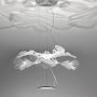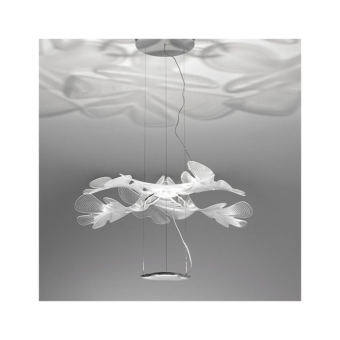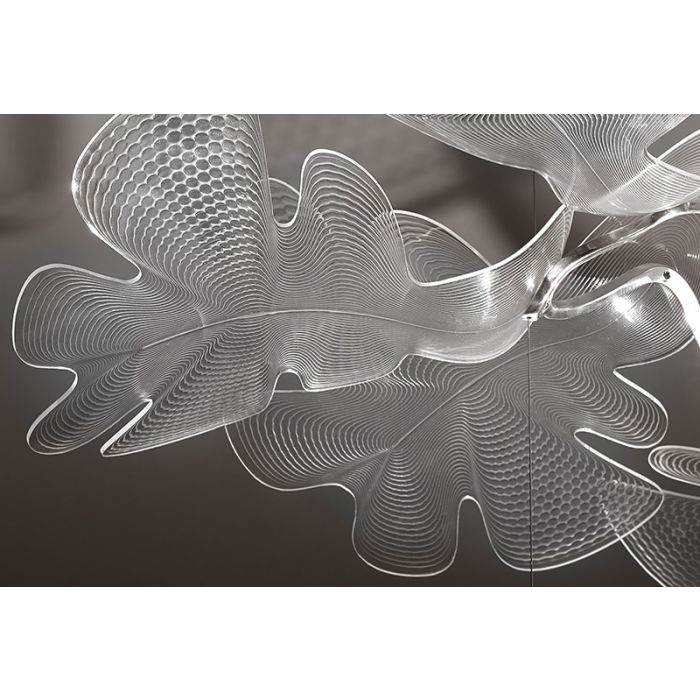 Chlorophilia est une nouvelle création de Ross Lovegrove qui, encore une fois, interprète la compétence d’Artemide dans le light engine du corps lumineux, avec sa griffe qui lui est si propre : ses inspirations bucoliques, ses formes organiques et fluides. C’est une suspension fortement scénographique mais légère. Ses trois éléments disposés en éventails qui se superposent se révèlent une fois allumés, lorsque la suspension dévoile ses jeux d’ombres délicates qui interagissent avec l’espace. Elle se compose d’un corps qui contient une LED COB faisant office de dissipateur et d’élément phytomorphique. Le corps central suspendu émet une lumière indirecte, filtrée et réfractée par les surfaces transparentes qui, par leur forme rappellent des éléments naturels ; des feuilles par exemple, confirmant que la nature est une véritable source d’inspiration pour ce designer. Il signe là un luminaire à fort potentiel scénographique ainsi qu’un bon rendement lumineux pour la pièce qu’il occupe.Les éléments composants Chlorophilia peuvent se répéter en les multipliant pour créer des luminaires qui habillent l’espace sur plusieurs niveaux ou s’étendant en ampleur.