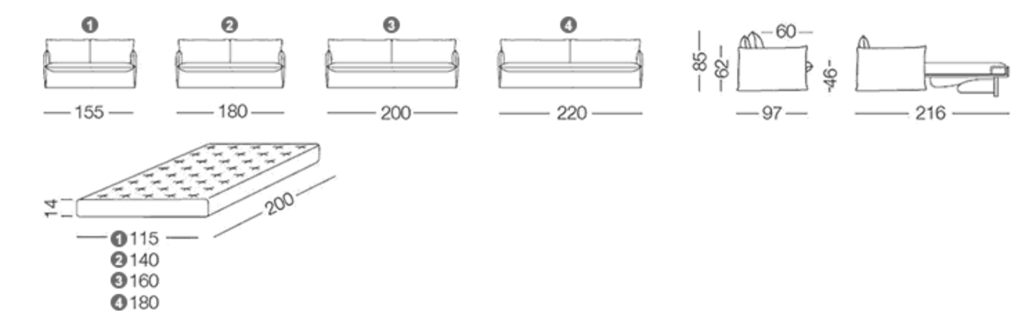 Taille 1 : Canapé lit 2 places L.155 x P.97 cm / lit une place et demie 115x200 cm