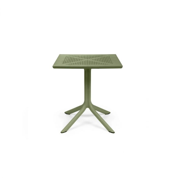 Clip 70 de Nardi par Raffaello Galiotto. Conçue tout spécialement pour occuper peu d’espace, Clip est une table carrée professionnelle en résine fibre de verre, à pied central à quatre branches, dotée d’un plateau DurelTop comportant un motif à cercles ajouré photogravé.