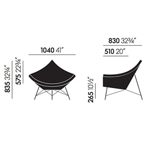 Cette création est typique du design des années cinquante (1955) qui se caractérise par une ligne pleine d’humour, des formes pures et l’utilisation parcimonieuse de matériaux. Nelson lui-même la comparait à un éclat de noix de coco qui se serait ouverte en huit morceaux, la couleur du Coconut Chair étant inversée: la coque extérieure de l’assise en matière synthétique blanche, le rembourrage d’une seule pièce est disponible en cuir noir.