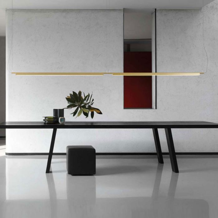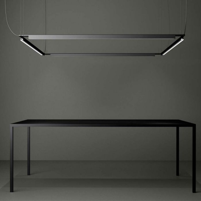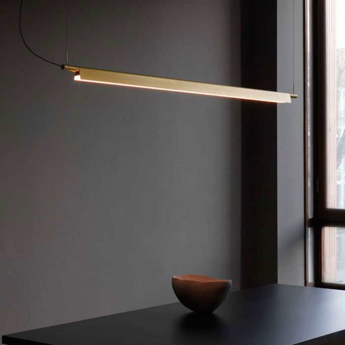 La suspension Compendium est une lampe essentielle et élégante qui répand une quantité suffisante de lumière sur les surfaces. Elle est polyvalente, pour un éclairage direct vers le bas ou indirect vers le haut, tout cela est ajusté en faisant tourner le réflecteur au moment de l'installation. Les joints linéaires en T permettent de multiples compositions. La lampe peut être utilisée avec un variateur mural.