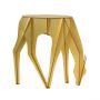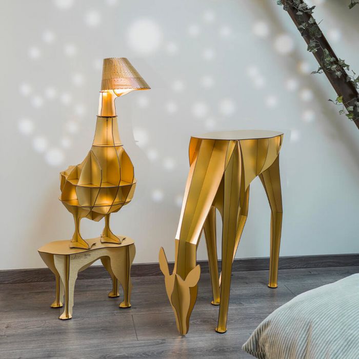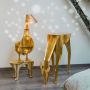 Console biche Diane capsule gold de Ibride. La silhouette élégante et fuselée de Diane rejoint à pas de velours la collection du Mobilier de Compagnie. Pose volée à un animal toujours aux aguets, on caresse l’espoir de l’observer à l’orée d’un bois sans être vu. La distance lisse ses contours, sa présence gracile devient figure mythique. Le dessin stylise ici la forme animale et la contraint, dans une recherche d’équilibre, de symétrie tranquille. Épurée de ses détails, elle devient essentielle comme une calligraphie en volume.