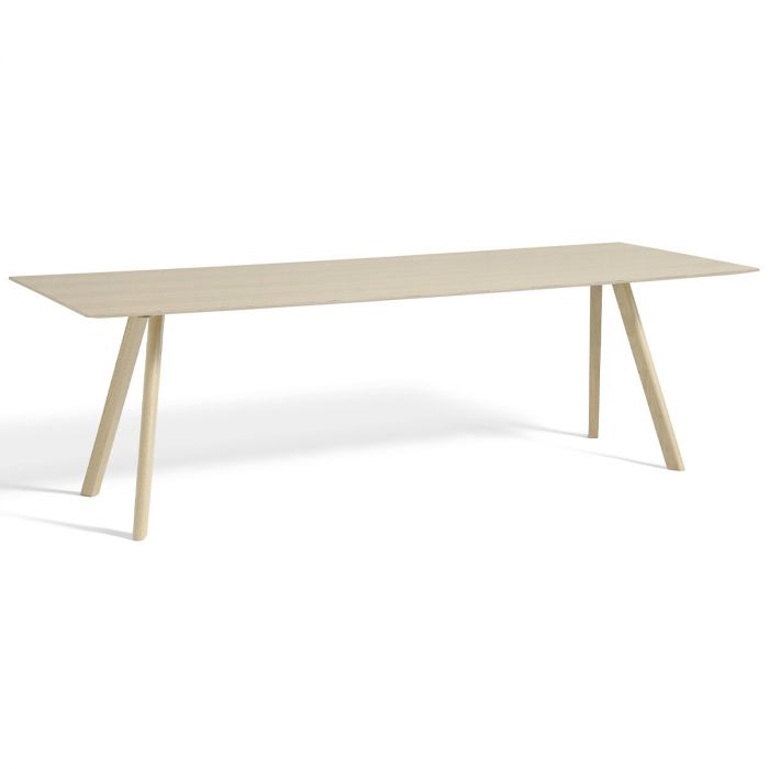 Copenhague table CPH30 - Pied chêne laqué 250x90 cm de Hay Erwan et Ronan Bouroullec. Appelés par la maison d’édition Hay pour ce projet de mobilier scolaire, Erwan et Ronan Bouroullec ont joué la carte de la simplicité et de la fonctionnalité, reprenant certains codes de l’architecte Pedersen, notamment l’esprit tréteau. Le bois est le matériau star de cette ligne au style épuré, composée d’une chaise, un tabouret et plusieurs modèles de tables. Avec cette collection Copenhague, les frères Bouroullec révèlent tout le potentiel design du bois, qui s’intègre très bien dans un intérieur contemporain. La table Copenhague est composée d'un plateau en chêne recouvert de lino, fixé sur un piètement tréteau en chêne massif. Cette table de salle à manger peut être accompagnée des chaises colorées de la même collection. Grâce à son plateau recouvert de linoléum, elle ne craint pas les tâches et se nettoie parfaitement d'un simple coup d'éponge. Cette table originale et design s'adaptera parfaitement à différents types d'intérieurs pour un effet très tendance !