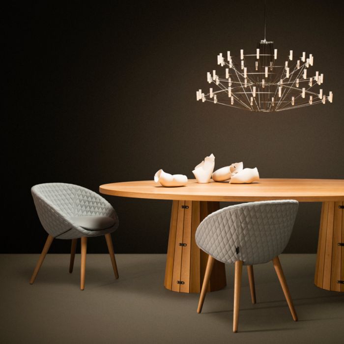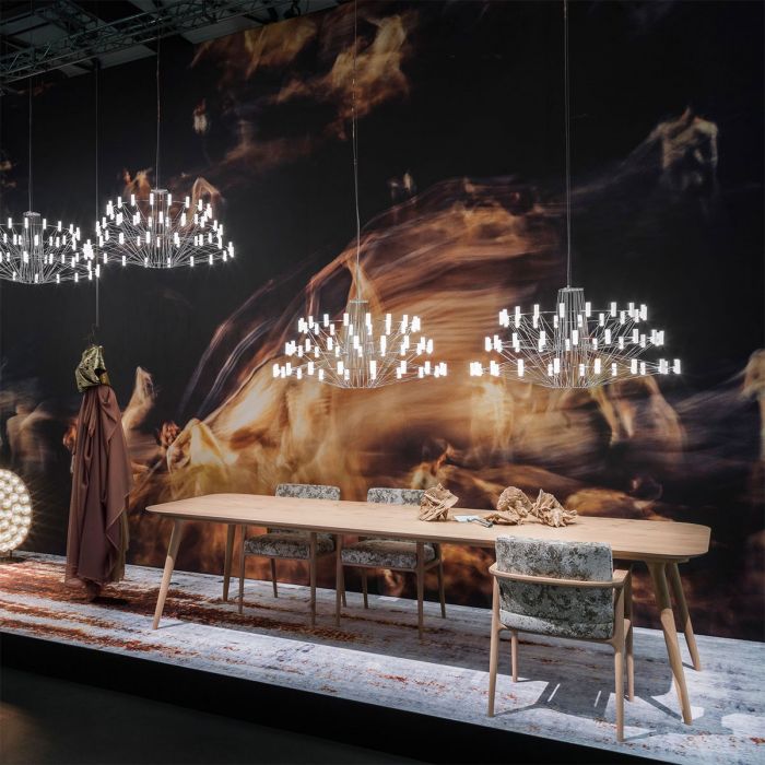 Les traits de danseuse de ballet de Coppélia, avec des mouvements sinueux, une image délicate dans les airs, qui inspire le mouvement du fluide dans le design de Coppélia de Miyake Suspension. La danse gracieuse, mis en scène par la structure métallique tridimensionnelle, conduit le spectateur à des dizaines de lumières LEDs, qui définissent le contour et la lueur magique de nouvelle interprétation de Miyake d'un lustre classique. le lustre Coppélia grande taille vous surprendra par sa finesse et sa structure géométrique changeante en fonction de l'orientation, à contempler sous tous les angles.