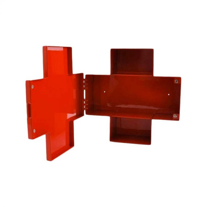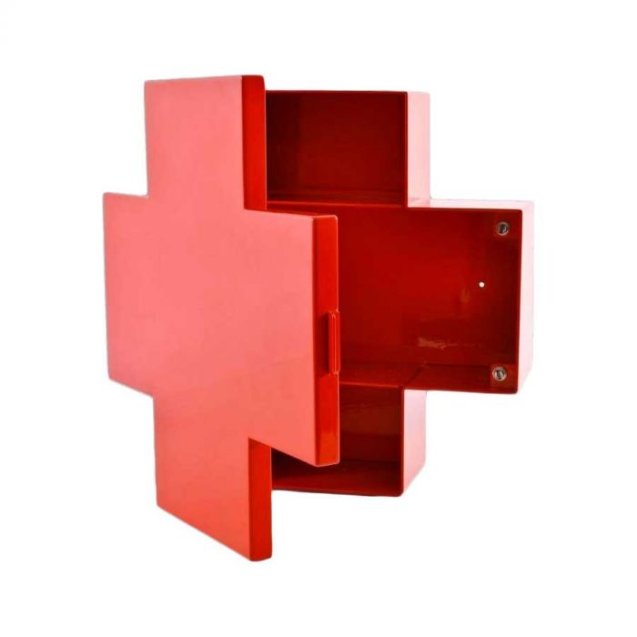 Conçue pour le rangement de médicaments, l'armoire Cross de Thomas Ericksson est suspendue au mur, disponible en rouge, orange, vert, bleu et blanc avec une finition vernis brillant.
