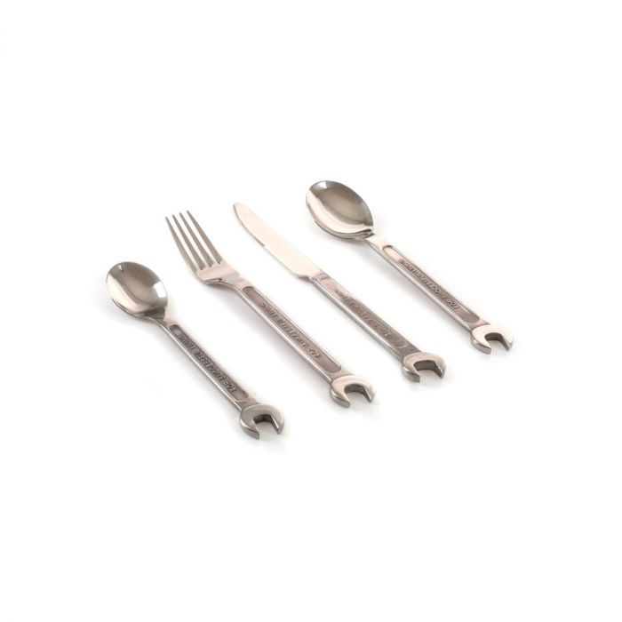 Cutlery set de Seletti. Un ensemble de vaisselle original composé de boulons et d'engrenages en porcelaine et en verre. Couverts Set de 4 pièces