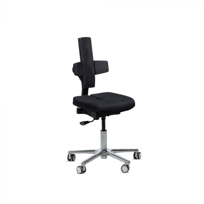 Matériaux : assise garnie revêtue en tissu, dossier polyuréthane plein, piètement aluminium, amortisseur d’assise, roulettes chromées.