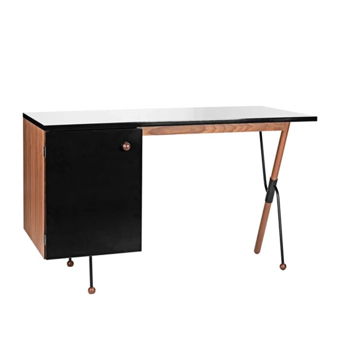 Conçu en 1952 par Greta M. Grossman, mais nommé le 62 Desk car il était réputé avoir dix ans d'avance sur son temps. Le bureau 62 semble typiquement léger et semble défier la gravité avec sa ligne asymétrique décalée et ses pieds en métal élancés en équilibre sur de petits pieds en bois, un trait caractéristique de son concepteur. Sa forme exceptionnelle est mise en valeur par le mariage élégant des matières. Le bureau est fabriqué en noyer américain et doté d'une finition noire profonde et brillante sur le dessus de la table et la porte de l'armoire. Le bureau comporte une armoire gauche comprenant deux tiroirs bas et un tiroir haut.