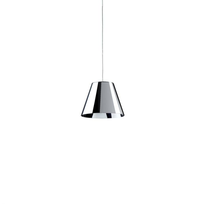 Le diffuseur de polycarbonate de la suspension Dina de Rotaliana est monté sur un corps en aluminium. Sous cette forme "ordinaire" se cache une source LED. Le diffuseur translucide ou chromé, devient transparente lorsque la lumière est allumée et révèle l'absence d'une ampoule traditionnelle, comme par magie.