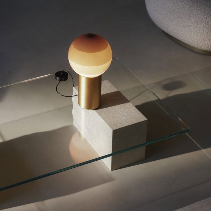 Jordi Canudas est un alchimiste de la lumière. Il en fait l'expérience, cherchant toujours à être surpris et à en tirer des leçons. Il veut capturer l'essence de la lumière. Dans cet objectif, la lampe à immersion a été créée comme une autre expérience - tremper une ampoule allumée dans la peinture plusieurs fois - avec le résultat final de cette lampe de table. Les différentes couches de peinture dessinent des cercles concentriques et capturent la lumière, modérant son intensité. La peinture devient l'ombre, colorant et texturant la lumière. Une base en laiton est ajoutée pour le support. Ce procédé artisanal fera de chaque lampe une création unique et exclusive.