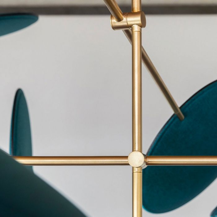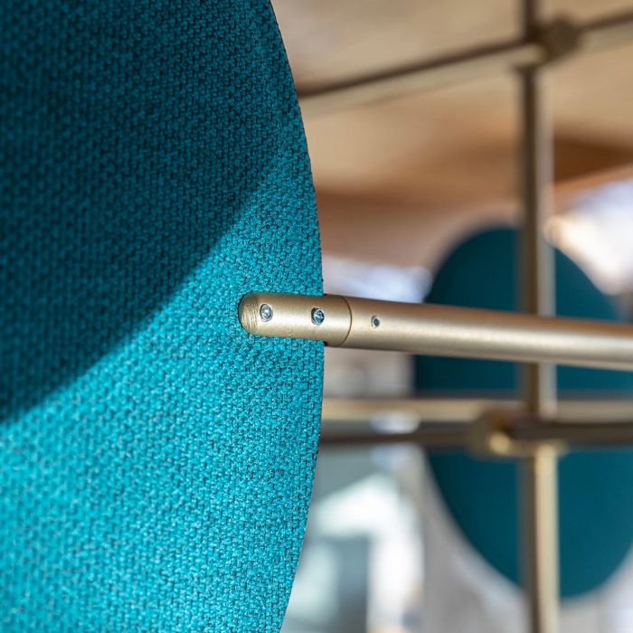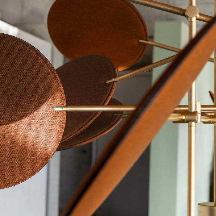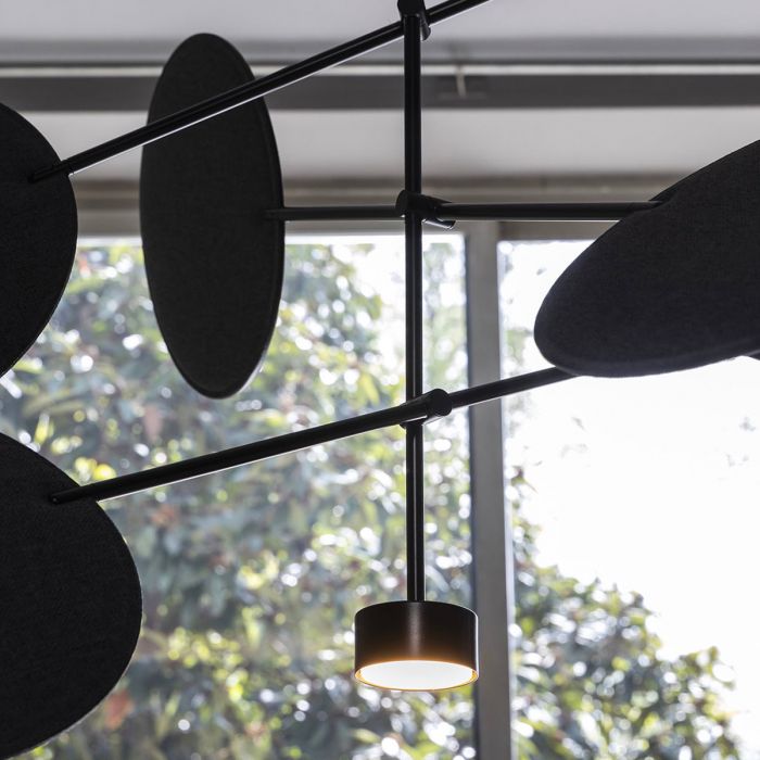 Lustre qui veut être le protagoniste de la salle à manger. Grâce à sa structure métallique élancée et ses éléments orientables aux propriétés insonorisantes, il capte l'attention et embellit l'atmosphère de la maison avec une forte personnalité.