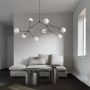 Sa suspension détaillée a des références industrielles et maritimes et est magnifiquement travaillée en métal plaqué, qui est ensuite brossé à la main pour obtenir la finition parfaite pour compléter les abat-jour circulaires en verre opale. Alors que la collection Drop Chandelier Bulp rend hommage aux conceptions de lampes emblématiques et modernistes des années 1950, elle célèbre également une approche expérimentale et innovante avec ses 14 bras réglables flexibles et fonctionnels - créant d'innombrables options et variations. Le lustre illumine élégamment la pièce d'une lumière chaleureuse et devient un objet sculptural au plafond.