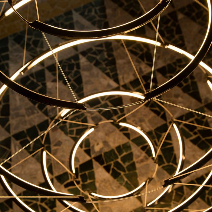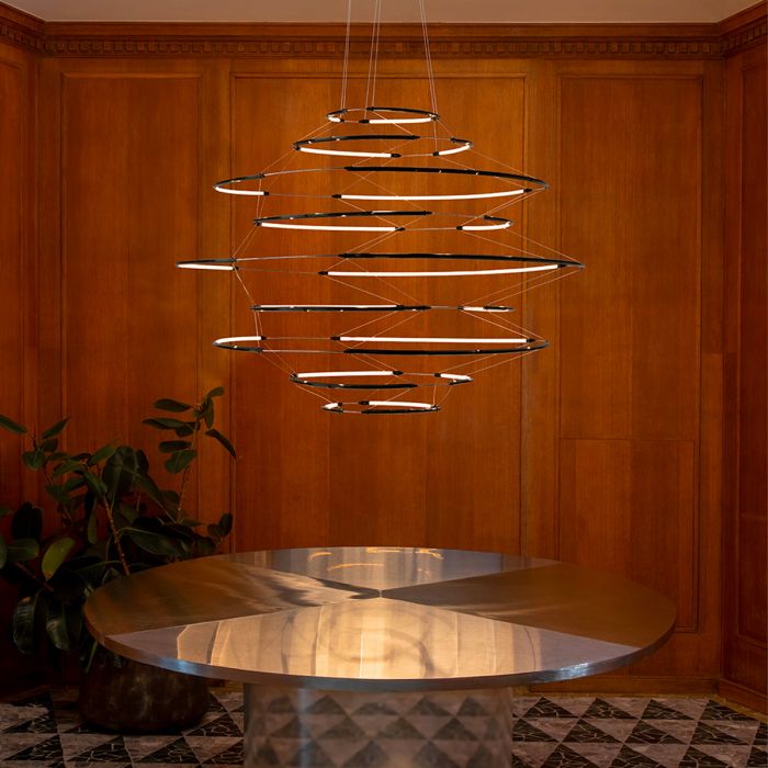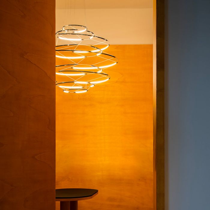 Instinct et souci de conception constant dans une collection qui est le résultat d'une ingénierie d'éclairage sophistiquée. Un lustre aux lignes claires associé à une structure en aluminium extrêmement fine pour un doux écho de lumière forte et diffuse. Chaque profil et connecteur est relié par une connexion miniaturisée pour un résultat unique de légèreté suspendue.