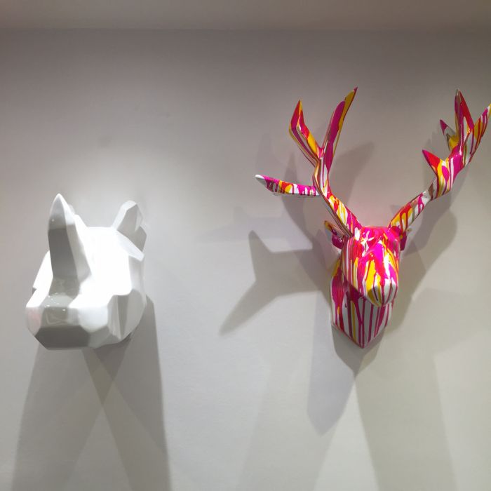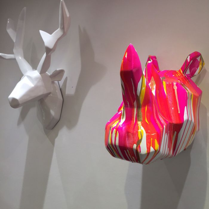 Le contraste visuel est saisissant, notamment avec la finition Pop Art (peinture coulante multicolore, comme illustré) qui injecte une dose d'énergie et de caractère à la sobriété du design. Disponible également en laque monochrome (blanc pur, noir intense), Duffy s'adapte à toutes les ambiances. Qu'il soit seul ou en composition murale (par exemple, avec le rhinocéros 'Grogny'), le trophée Duffy d’Artypopart ajoute une touche audacieuse et décalée, partout où il est accroché. C'est l'assurance d'un point focal inoubliable qui conjugue la beauté de l'animal de la forêt et l'esprit avant-gardiste du design.
