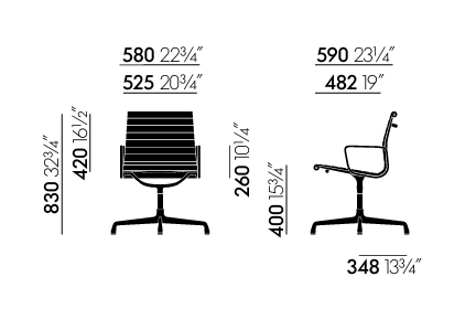 Grâce à leurs proportions généreuses et à la souplesse de leur assise – un panneau de cuir, de tissu ou de résille tendu entre deux profi lés d’aluminium – les Aluminium Chairs EA 105, 107 et 108 off rent un confort exceptionnel. Le grand choix de couleurs de revêtement permet de trouver le siège parfait pour tout usage. Le modèle EA 108 avec accoudoirs est doté d’un mécanisme pivotant, tandis que l’EA 105 sans accoudoirs et l’EA 107 avec accoudoirs sont dotés d’un piètement fixe.