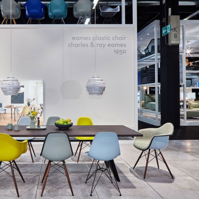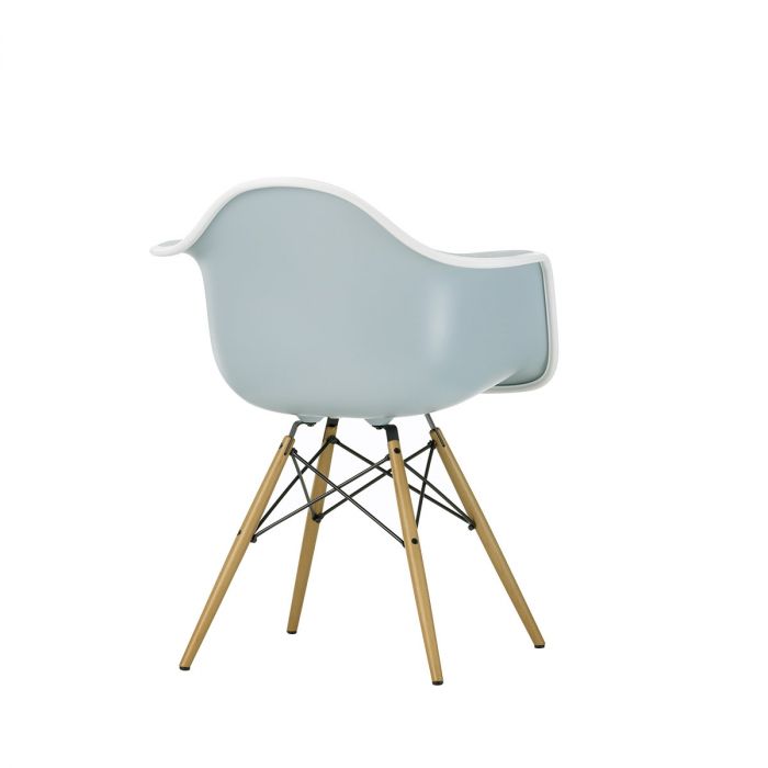 La Plastic Chair de Charles et Ray Eames est aujourd’hui l’exemple type du modèle de siège dont la coque peut se combiner à différentes matières et piètements. Le piètement en bois de la Dining Height Armchair Wood Base (DAW) produit avec la coque synthétique un contraste de matériaux intéressant. Ce modèle est entièrement rembourrées.