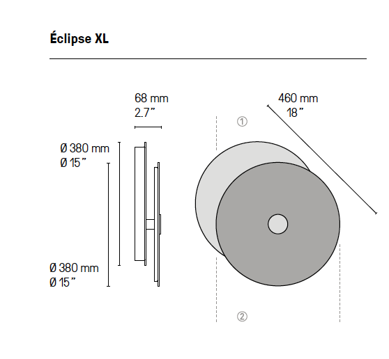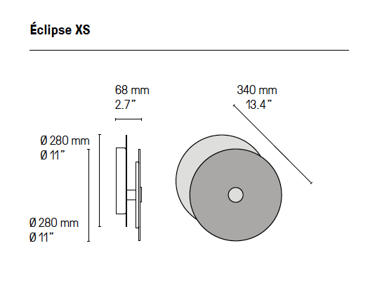 Série d'appliques déclinée en deux diamètres, Éclipse joue de disparition entre sa dalle de led et ses deux disques de laiton. Un objet céleste qui ensoleille les architectures. L'applique Éclipse est fixe. Une fois positionnée au mur, elle ne peut pas tourner.