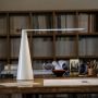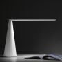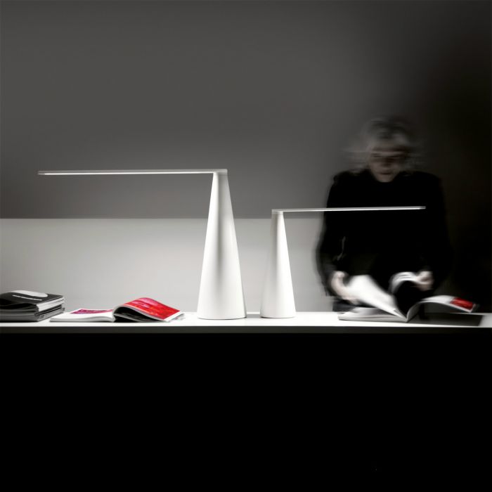 Lampe Elica de Martinelli, avec corps en métal et un bras ajustable en aluminium peints en blanc. La lampe est controlée par la rotation du bras. Elle utilise une source LED. Dessinée par Brian Sironi en 2009, elle est disponible en deux tailles. Le mouvement produit la lumière, par rotation du bras, Elica ne se soulève pas par le haut mais elle illumine, il ,'y a pas d'interrupteur qui altère l'harmonie de sa forme; c'est un simple luminaire qui, comme un jeu amusant,permet à l'imagination et à la fantasie de s'envoler.