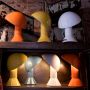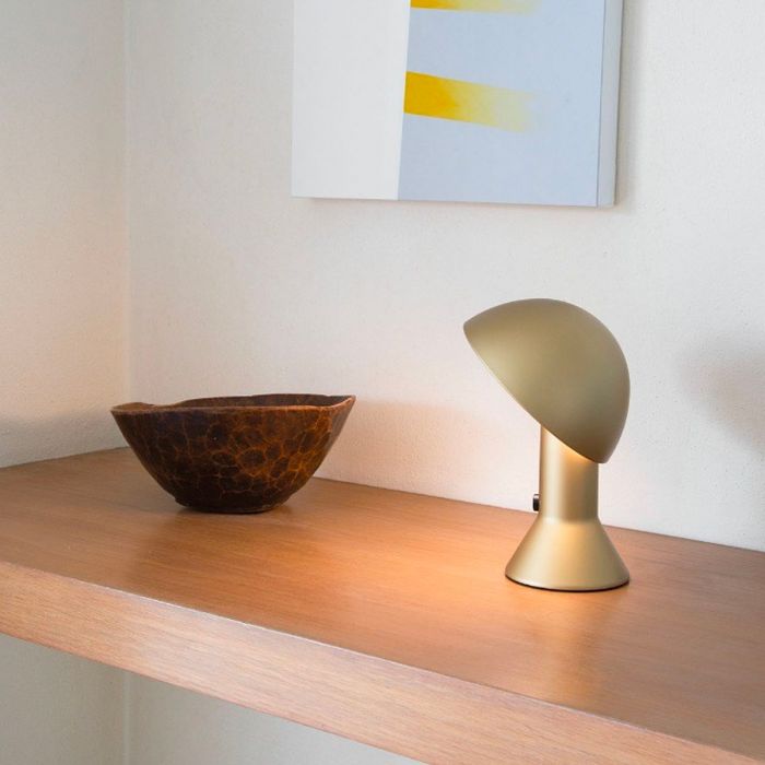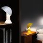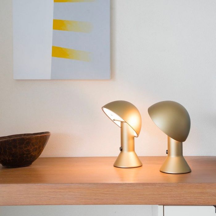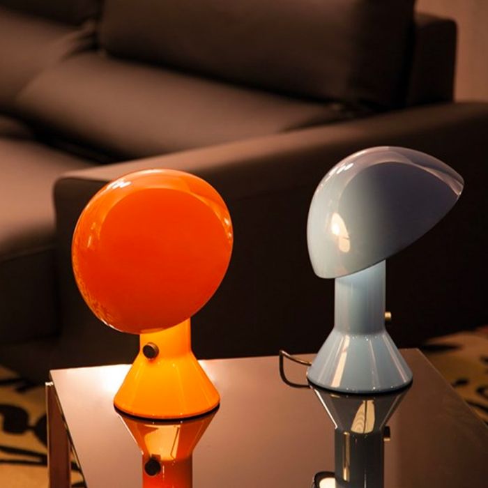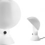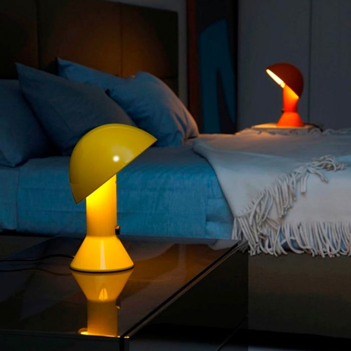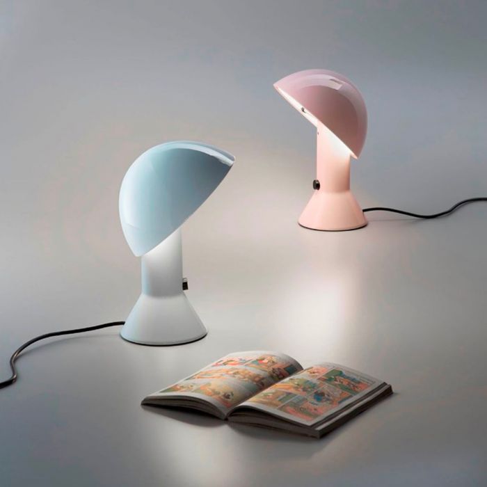 Elmetto est une magnifique lampe de table avec lumière directe et indirecte avec une structure entièrement en résine blanche. Cette lampe se compose d'un tron très stable et d'un diffuseur réglable avec une forme hémisphérique. Elmetto, dessinée par Elio Martinelli en 1976, en dépit de sa conception exacte, favorise la fonctionnalité de l'utilisation d'un commutateur de grande taille sur le corps central, facile à trouver même dans l'obscurité, et un réflecteur qui, par une simple pression avec le doigt, permet de régler la source de lumière.