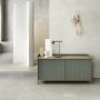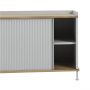 Matériaux : Corps, étagères et portes coulissantes en acier plié peint par poudrage. Plateau et piètement en chêne massif