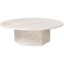 GamFratesi a conçu la table basse Epic pour GUBI comme un meuble sculptural inspiré des colonnes grecques et de l'architecture romaine et nommé d'après les poèmes épiques des temps anciens. Fabriquée en Italie à partir de pierre de travertin, la forme monolithique souligne la matérialité de la pierre, la beauté naturelle de ses veines et la texture vibrante de sa patine unique - dans laquelle un nouveau détail peut être découvert à chaque utilisation.