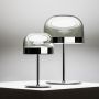 Equatore est la réinterprétation avec un goût contemporain des lampes classiques avec abat-jour en verre. Si, fans les abat-jour traditionnels, le diffuseur contient la source lumineuse, dans cette famille de lampes, il est paradoxalement et suggestivement vide et l’effet lumineux est produit part deux disques lumineux situés à l’intérieur d’une bande métallique centrale, visible sur l’abat-jour et rappelant la ligne de l’Équateur. La lumière produite par les led, grâce aux écrans intérieurs disposés en couches, se distribue régulièrement sur la surface des disques, en les faisant rayonner d’une lumière magique. Le disque inférieur produit une émission lumineuse vers le bas, tandis que le disque supérieur éclaire la calotte de verre, pour donner une diffusion douce de la lumière. Disponible en version de table, de sol, et à suspension, en deux mesures.
