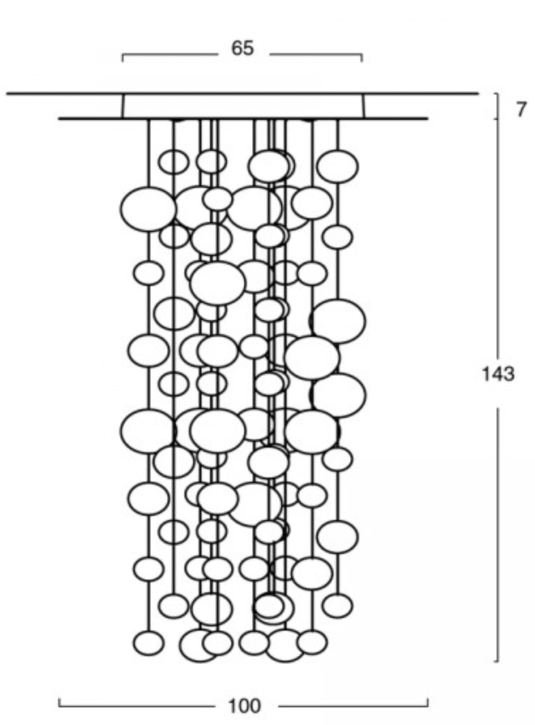 La suspension Ether 90 s designer par Patrick Jouin pour Muranodue représente une cascade de bulles en verre de Murano. Ces bulles sont illuminées depuis le haut au moyen de quatre spots et d'une LED multicolore en option, ce qui donne lieu à des effets de lumières particuliers. La structure métallique est en acier poli.