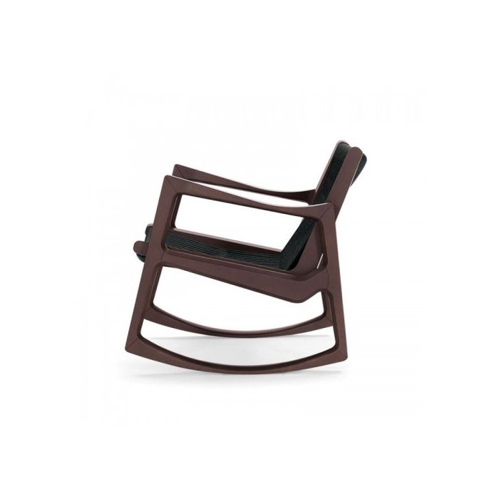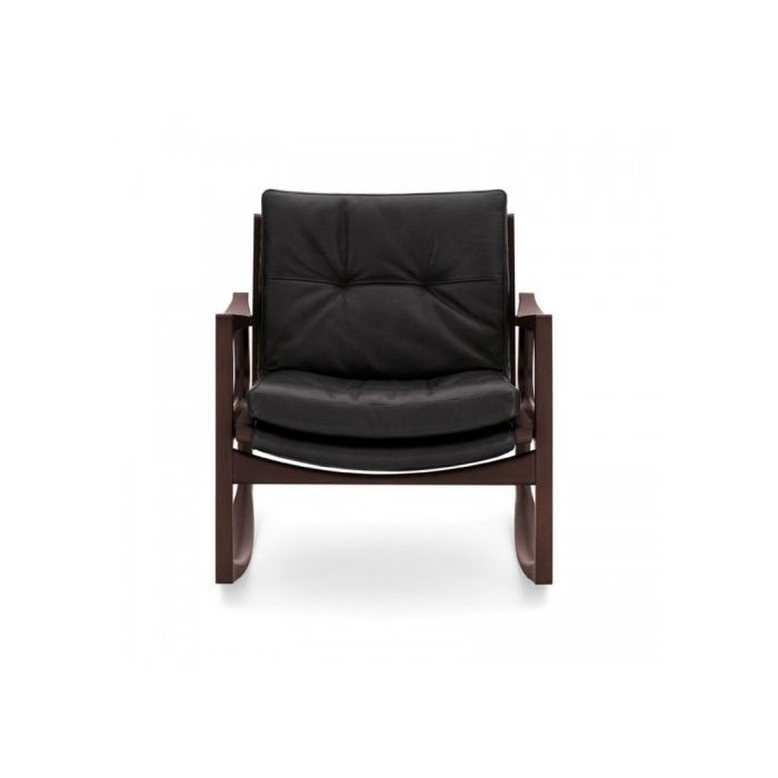 Tout en offrant le confort d'un large fauteuil à bascule, ses lignes finement dessinées, ses accoudoirs et ses patins affinés des côtés vers la partie centrale lui confèrent légéreté et élégance.