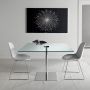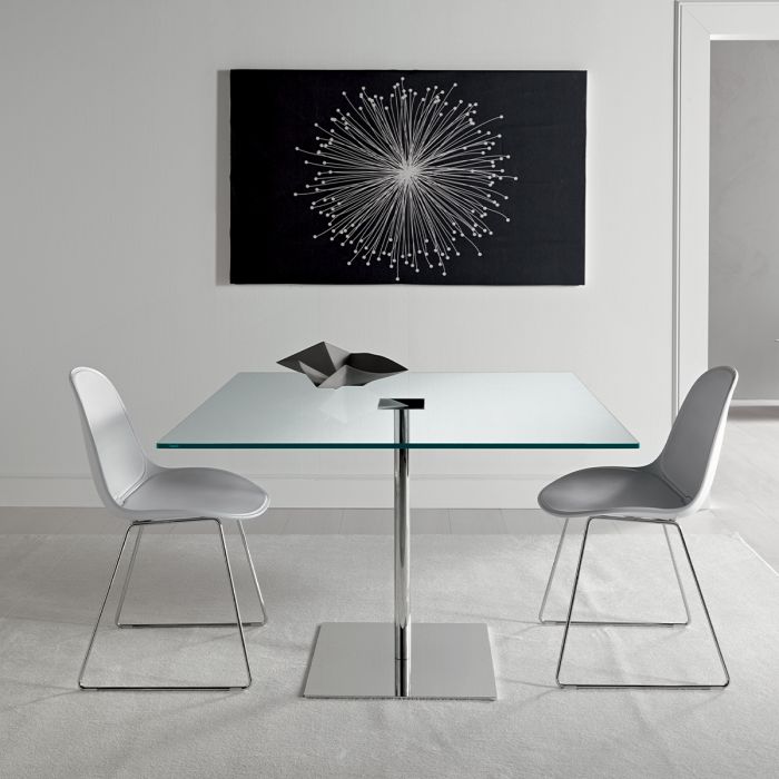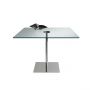 Table haute en verre trempé. Base en métal chromé. Disponible en trois versions : carrée, ronde et rectangulaire.