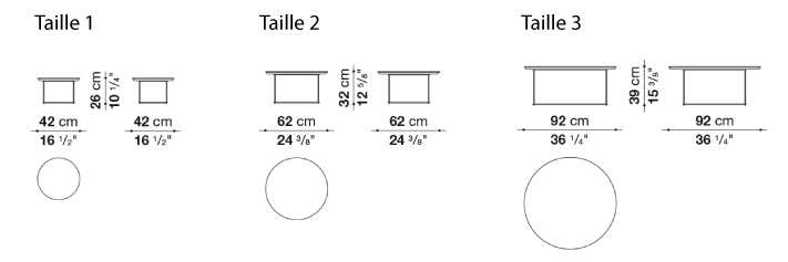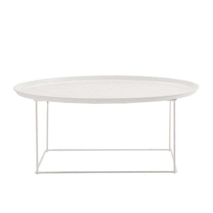 Le thème du plateau, en blanc, noir et avec finition cuivrée, est repris pour faire voir le jour à trois tables basses dont l'allure légère est conférée par la structure en acier. Elles peuvent être superposées. Un quatrième modèle, plus haut que les autres, offre un appui très pratique à côté d'un canapé.