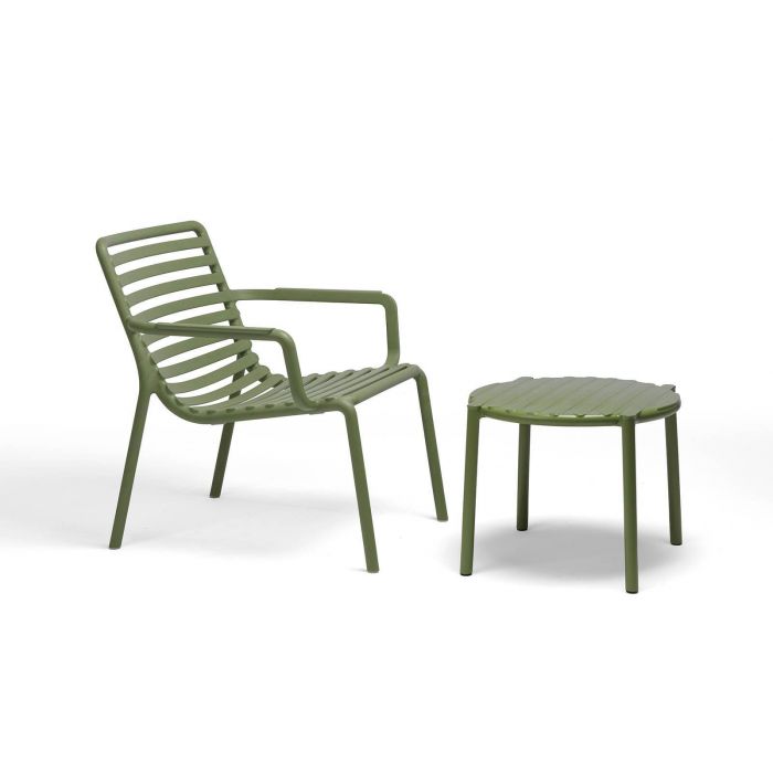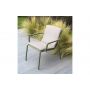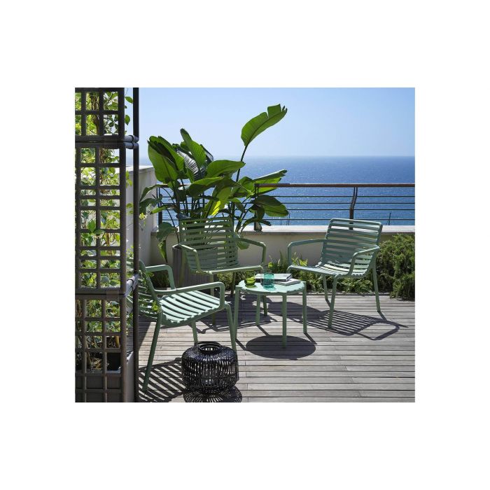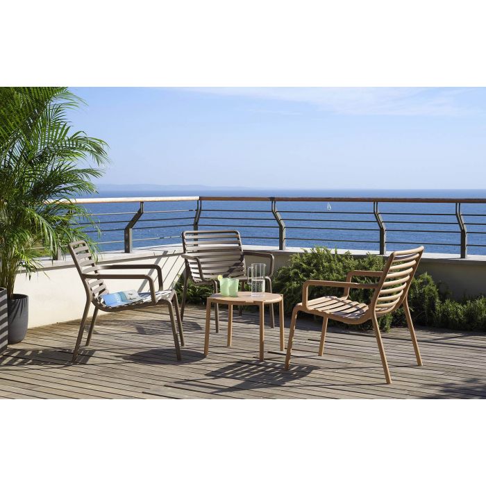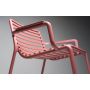 Fauteuil large de relaxation abaissé de plein air en résine de fibre de verre se distinguant par un jeu de pleins et de vides ponctués par une séquence de lattes horizontales. Empilable, facile à désinfecter et recyclable.