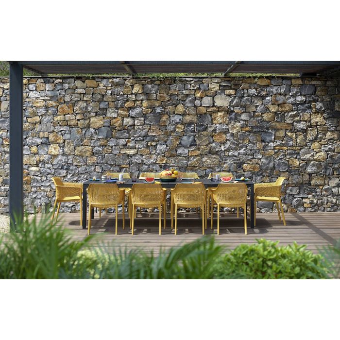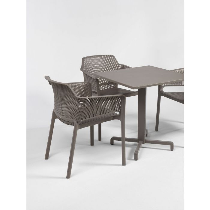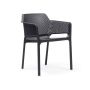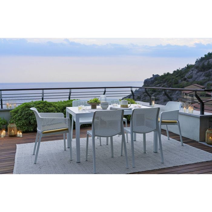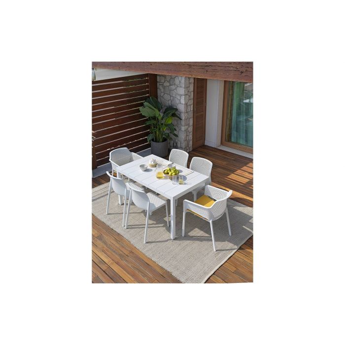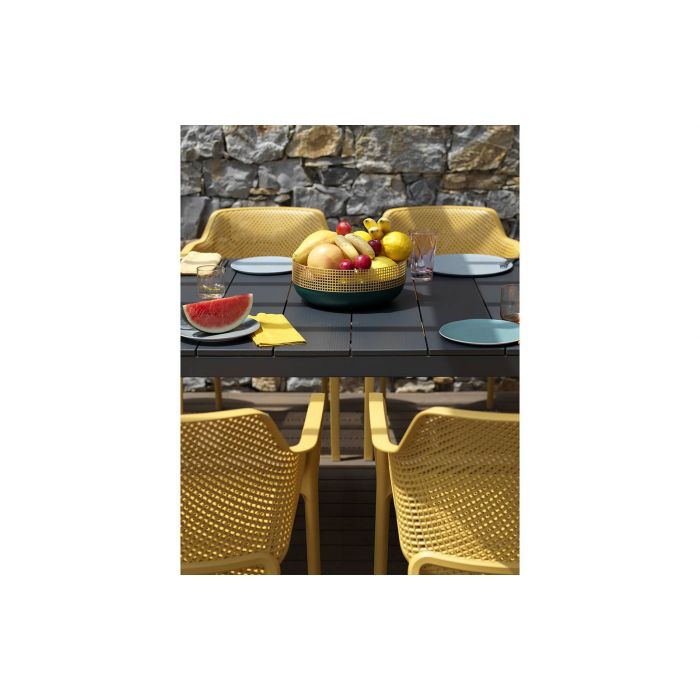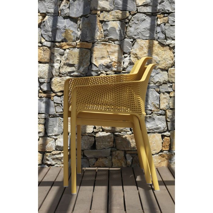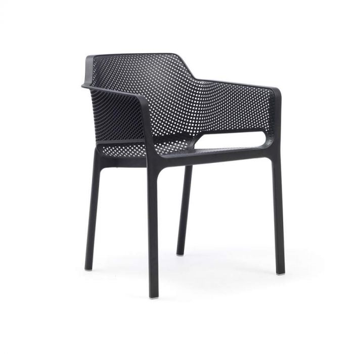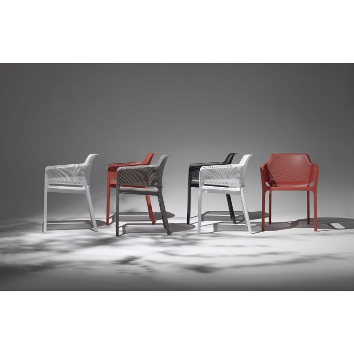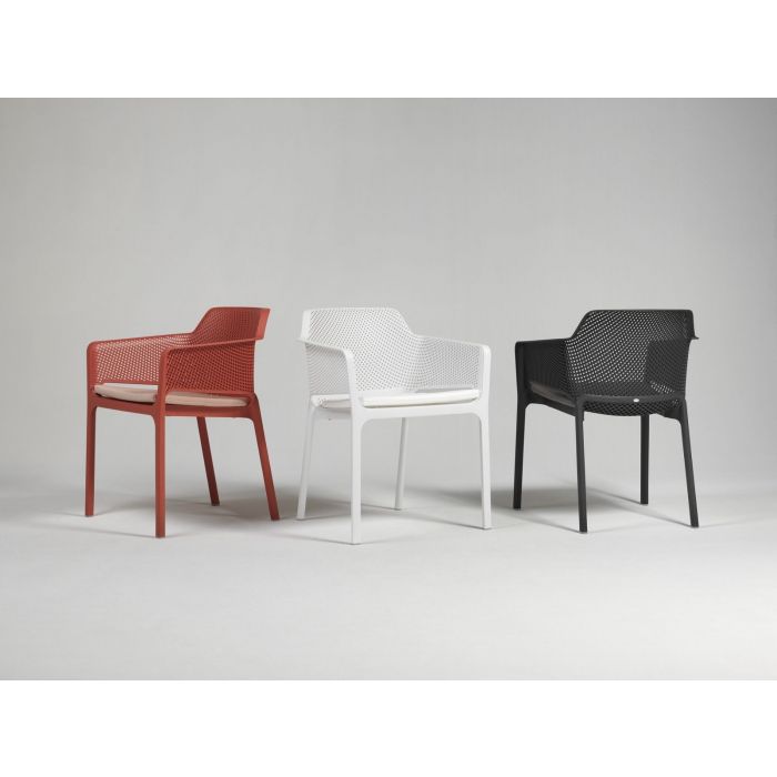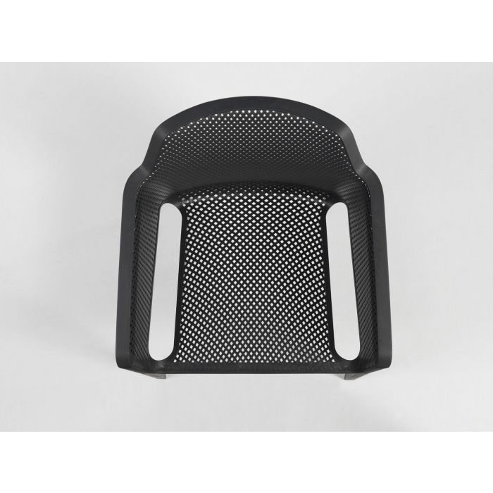Relaxation raffinée pour Net, monocoque en résine fibre de verre soigneusement criblée de motifs à fleurs carrées et rayonnantes répartie régulièrement sur la surface tridimensionnelle de l’assise.