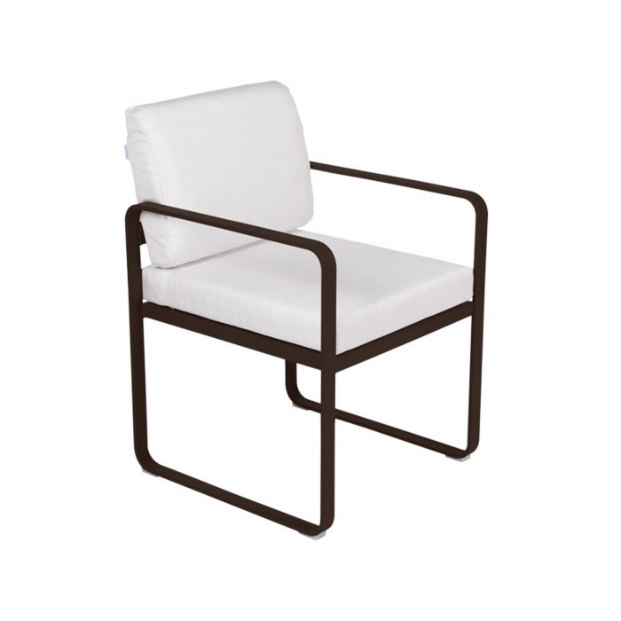 Fauteuil repas Bellevie - blanc grisé de Fermob. La famille Bellevie s’agrandit avec un fauteuil de table, parfait pour prendre votre repas, attablés à l’une des tables de la même collection. Confortablement installés prolongez le moment, faites durer déjeuners et dîners. Indéfiniment... Le fauteuil-repas Bellevie est là pour ça ! Il vous appelle à vous régaler de manière décontractée. Il est également parfait pour chiller après le repas, ce fauteuil-là ! Ultra-accueillant, avec ses coussins d’un confort absolu, garnis de mousse polyuréthane haute résilience et enveloppés de tissu Sunbrella® d’une étonnante douceur, le fauteuil de table Bellevie vous garantit des repas bien assis. Grâce à ce tissu outdoor 100% acrylique teint masse, résistant aux taches, à la moisissure, aux déchirures et à l’abrasion mais aussi grâce à sa structure 100% aluminium recouverte de peinture poudre polyester, votre fauteuil-repas Bellevie affronte les intempéries et les climats les plus rudes, en bord de mer notamment. Afin de les tenir toujours propres et pimpants, ses coussins sont déhoussables et leurs housses, lavables en machine. Le souci du détail est tel, chez Fermob, que le coussin du dossier est équipé d’une poche, à glisser par-dessus la structure afin de dissimuler habilement la partie métallique de l’arrière de votre fauteuil-repas, pour un fini très élégant. Enfin, la hauteur de ses accoudoirs est ajustée pour passer sous les plateaux de toutes les tables de la collection, ce qui ouvre large le champ des associations possibles ! N’hésitez pas à adopter un « total look » Bellevie sur votre terrasse avec votre fauteuil-repas ultra-douillet : alors, quelle table de la gamme pour l’accompagner ? Vous avez l’embarras du choix ! Laissez libre cours à votre imagination...