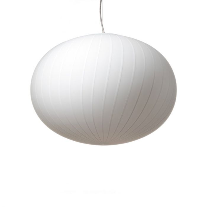 Matériaux : Verre soufflé bouche gravé à l'acide, fixation en acrylique et acier poudré, câble de suspension en acier