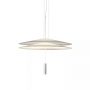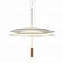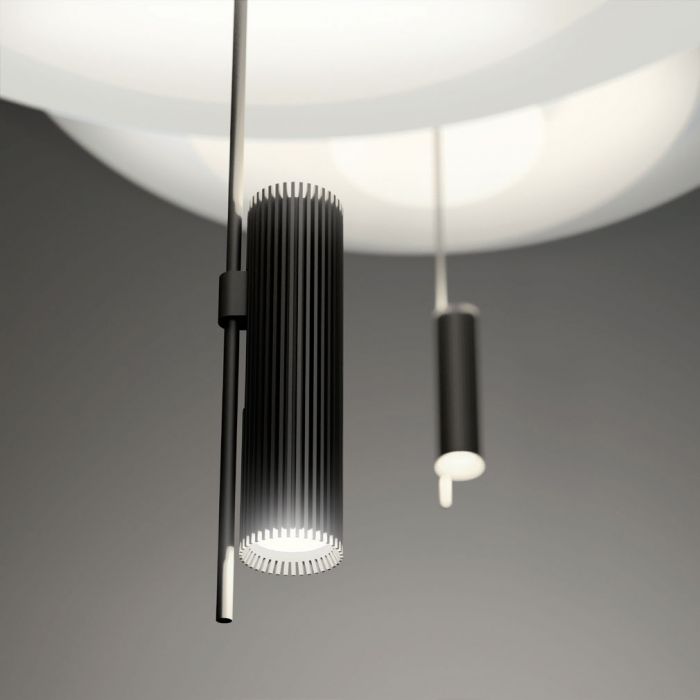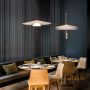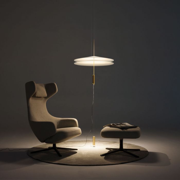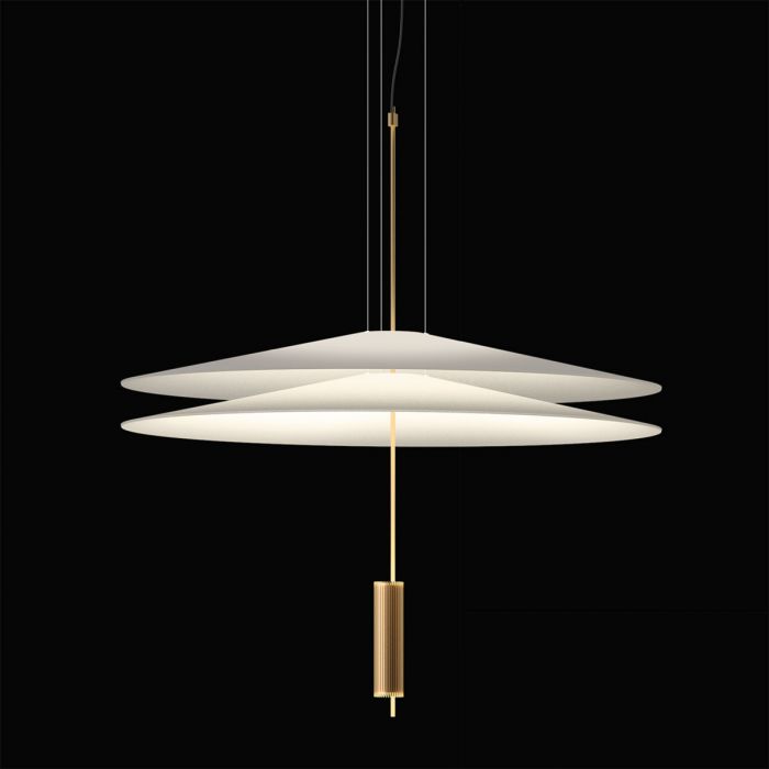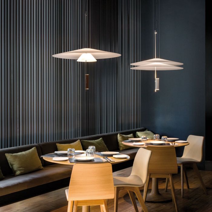 Suspension Flamingo de Vibia, par le designer Antoni Arola. Le défi était de projeter la lumière sur le diffuseur de la lampe plutôt que d'entourer la source de lumière. Le résultat, un effet éthéré, où la lampe et sa luminance sont déconstruits.